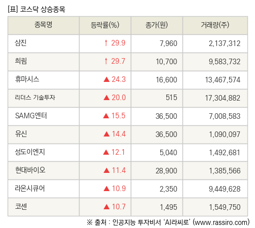 [fnRASSI]장마감, 코스닥 상승 종목(삼진 29.9% ↑)