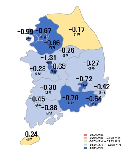 경기·인천 역시 하락폭이 다소 줄었다. 경기는 지난주 -0.99%에서 0.86%로, 인천은 -1.18%에서 0.99%로 낙폭이 각각 축소됐다.