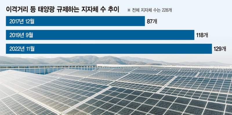 그 사이 태양광 이격거리 등을 규제하는 지자체 수는 빠르게 늘었다. 2017년 12월 87곳이던 태양광 규제 기초지자체 수는 지난해 11월 기준 129곳까지 증가했다. 약 5년 동안 48.2% 늘어난 셈이다.