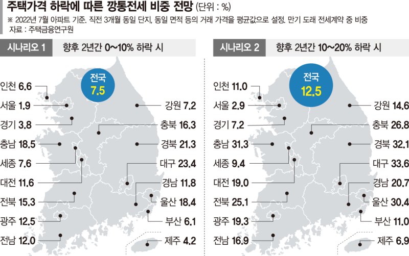시나리오 1에서는 전국적으로 7.5%, 2에서는 8건 중 1건 수준인 12.5%가 깡통전세가 될 것으로 전망됐다. 시나리오 2를 기준으로 대구는 깡통전세 확률이 3건 중 1건인 33.6%에 달할 것으로 추정됐고 경북(32.1%), 충남(31.3%), 울산(30.4%) 등도 깡통전세 우려가 컸다.