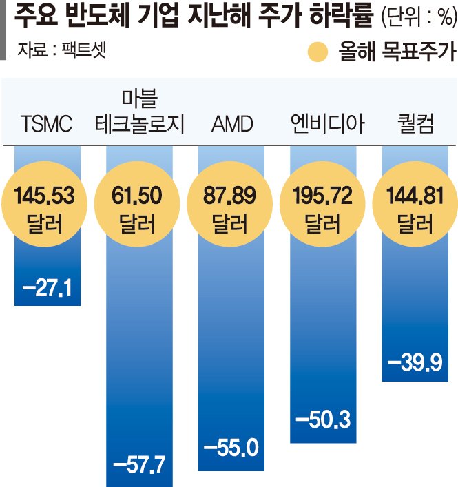 8일(현지시간) CNBC에 따르면 마블테크놀로지를 비롯해 AMD, 엔비디아 등의 지난해 주가는 각각 반토막이 났다. 대표적 반도체 ETF인 아이쉐어스반도체ETF 수익률도 마이너스(-)36%를 기록했다.