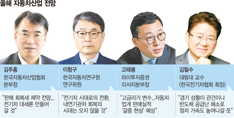 고태봉 하이투자증권 리서치본부장은 "고금리가 변수가 될 수밖에 없다"면서 "글로벌 자동차 시장이 전체적으로 4% 정도의 성장은 하겠지만 자동차 업계로선 이 정도 성장 가지고선 상당한 갈증현상을 느낄 것"이라고 말했다. 고 본부장은 자동차 업계 최대 호황으로 여겨졌던 2017년도 수준으로의 회복은 2025년은 돼야 가능할 것이라고 예상했다.