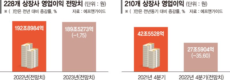 에프앤가이드에 따르면 증권사 3곳 이상의 추정치가 존재하는 상장사 210곳의 지난해 4·4분기 추정 매출과 영업이익은 604조9675억원, 27조5904억원이다. 1년 전보다 매출은 11.60% 늘어나지만 영업이익은 35.60% 감소할 것으로 분석된다. 상장사들의 영업이익이 10조원 넘게 축소될 것으로 보인다.