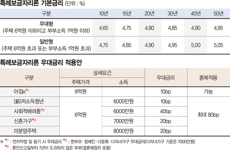 금리는 △주택 가격이 6억원 이하이고 부부 합산 소득이 1억원 이하인 차주는 4.65~4.95% △주택 가격이 6억원을 초과하거나 소득이 1억원을 초과하는 차주는 4.75~5.05%이다. 차주 특성별로 우대금리를 최대 0.9%포인트(p) 부여한다. 다만 시장금리 상황, 주택금융공사 가용재원 등을 감안해 필요 시 금리가 조정될 수 있다. 만기는 10년부터 50년까지 6가지 중 선택할 수 있다.