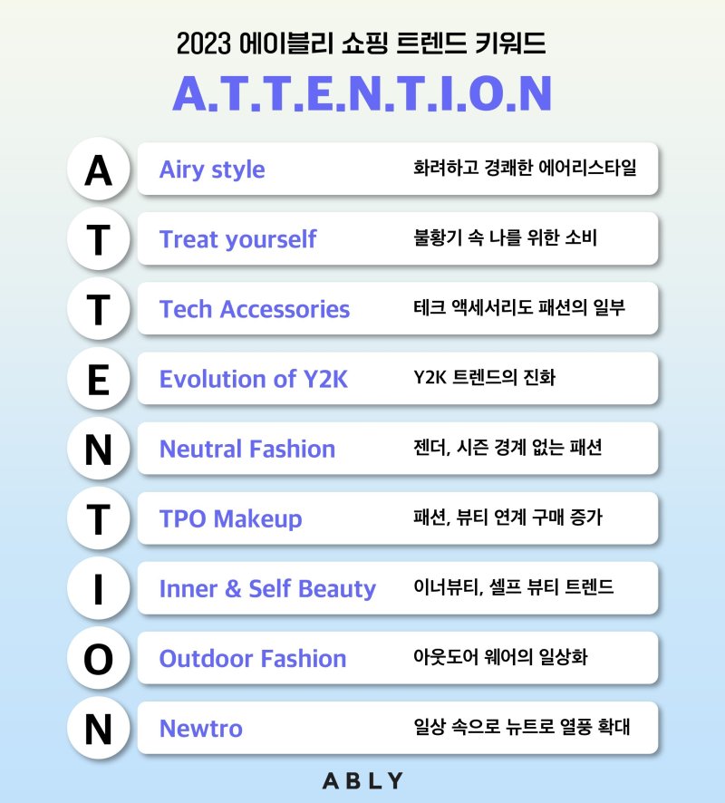 A.T.T.E.N.T.I.O.N은 △Airy style(화려하고 경쾌한 에어리스타일) △Treat yourself(불황기 속 나를 위한 소비) △Tech Accessories(테크 액세서리도 패션의 일부) △Evolution of Y2K(Y2K 트렌드의 진화) △Neutral Fashion(젠더, 시즌 경계 없는 패션) △TPO Makeup(패션, 뷰티 연계 구매 증가) △Inner & Self Beauty(이너뷰티, 셀프 뷰티 트렌드) △Outdoor Fashion(아웃도어 웨어의 일상화) △Newtro(일상 속으로 뉴트로 열풍 확대)를 의미한다.