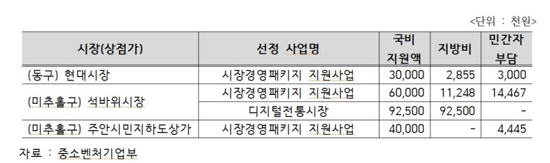 선정지는 △동구 현대시장(3000만원) △미추홀구 석바위시장(1억5250만원) △미추홀구 주안시민지하도상가(4000만원)로 맞춤형 마케팅·상인교육 등 상인회의 자율 사업을 지원받는 시장경영패키지 지원사업에 선정됐다.
