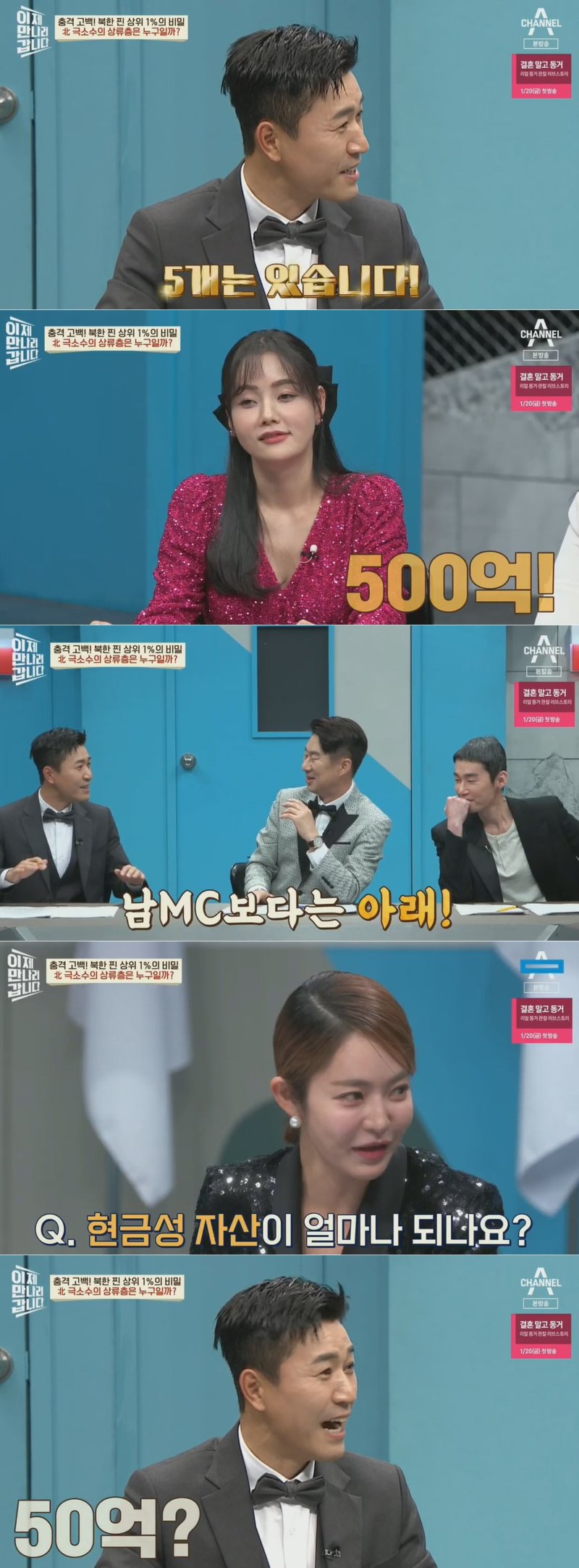 그러면서 김종민은 "다섯 개는 있다"라고 결국 숫자까지 거론하며 재산에 대해 밝혔고, 이에 출연자들은 "50억?"이라고 물었지만 김종민은 "아니다"라고 말했다.