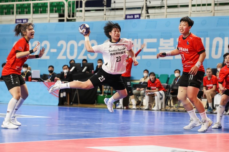 14일 부산 기장체육관에서 열린 부산시설공단과 삼척시청의 2022-2023 SK핸드볼 코리아리그 여자부 1라운드 경기는 26-26으로 승부를 내지 못했다.