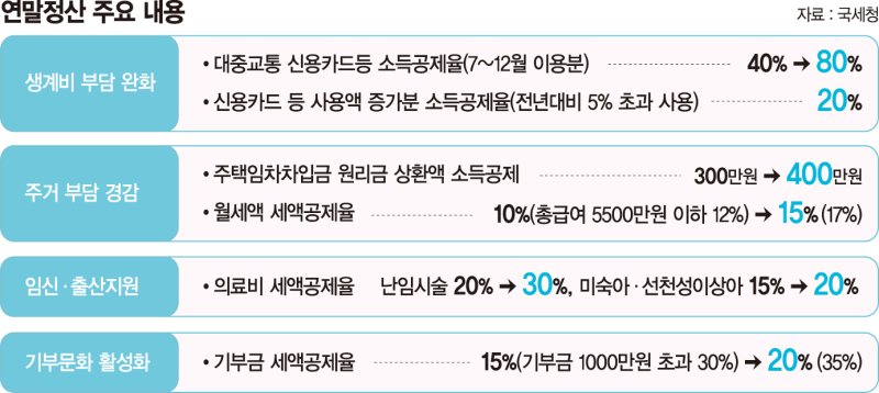 이번 연말정산에선 신용카드 사용액과 대중교통비, 월세 등의 세액공제가 확대된다.