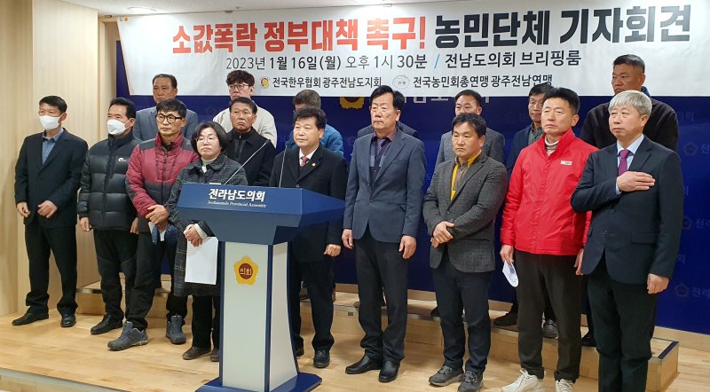 전국한우협회 광주전남도지회와 전국농민회총연맹 광주전남연맹은 16일 오후 전남도의회에서 기자회견을 갖고 "한우 가격 폭락에 대한 정부 차원의 책임 있는 조치가 마련돼야 한다"며 "도축 물량 증가분에 대한 정부 비축이나 시장격리 같은 대책을 세워야 한다"고 주장했다.