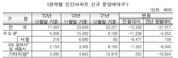16일 한국주택도시보증공사(HUG)에 따르면 2022년 12월 전국 신규 분양 민간아파트는 1만1304가구로 전년 동월(3만3221가구)보다 66% 줄어들었다.