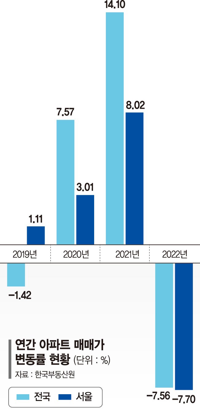 16일 한국부동산원에 따르면 2022년 수도권 아파트 매매가는 전년 대비 9.68% 급락했다. 관련 통계가 작성된 지난 2003년 11월 이후 최대 하락률이다. 종전 사상 최대 하락률인 2012년(-5.77%)을 10년 만에 갈아치웠다.