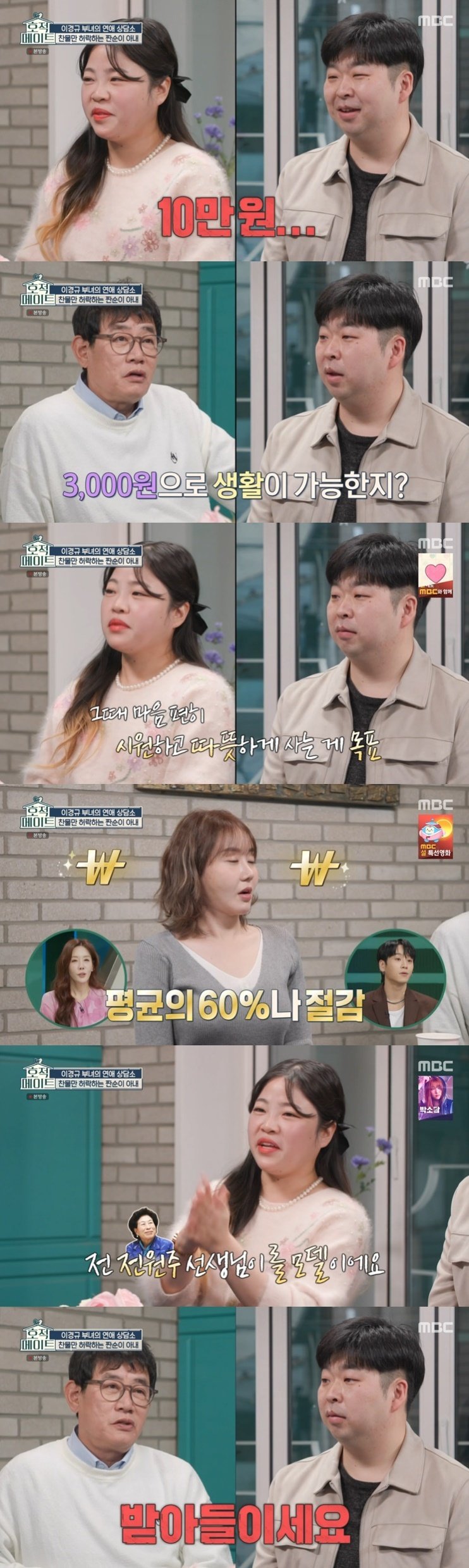 이에 이경규는 "벌써 미래를 내다보고 있다"라더니 "남편 분께 이런 말씀 드리고 싶다. 받아들이세요"라고 해 폭소를 유발했다. 또한 "아내 분이 알뜰한 똑순이다. 그걸 복이라 생각해라"라고 조언해 눈길을 모았다.