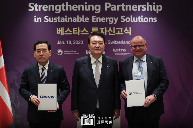 대통령실에 따르면 18일(현지시간) 스위스 다보스 한 호텔에서 헨릭 앤더슨 베스타스 최고경영자(CEO)는 이창양 산업통상자원부 장관에게 직접 한국에 3억달러(약 3700억원)를 투자하겠다고 신고했다.