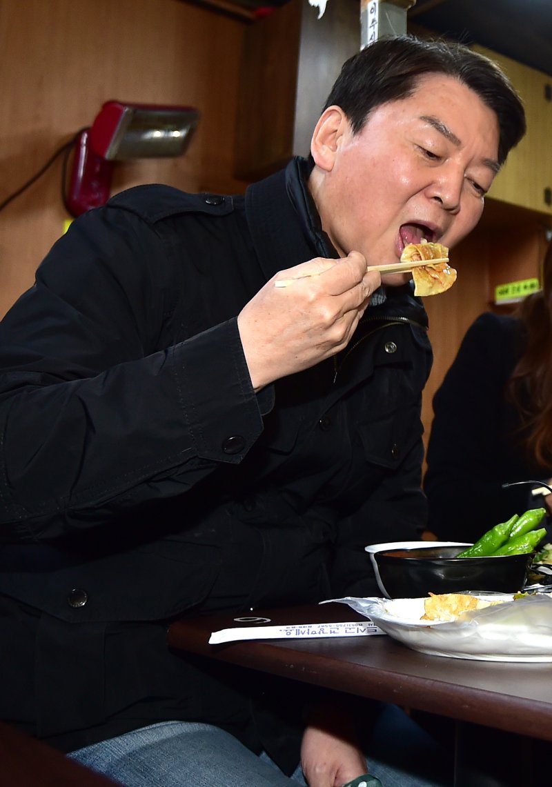 [대구=뉴시스] 이무열 기자 = 국민의힘 당권주자인 안철수 의원이 19일 오후 대구 중구 서문시장을 방문해 납작만두를 먹고 있다. 2023.01.19. lmy@newsis.com [서울=뉴시스] 류현주 기자 = 국민의힘 당권주자인 안철수 의원이 19일 보수텃밭인 대구를 찾았다.