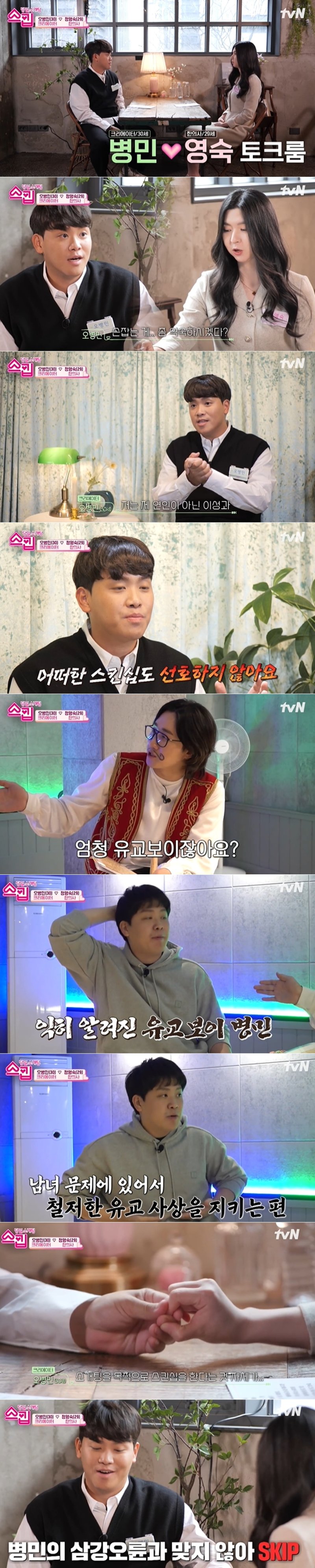 하지만 오병민은 "제 여자친구와 남자인 타인이 할 수 있는 건 없다"고 반대 의견을 보이며 '스킵' 버튼울 눌러 모두를 안타깝게 만들었다.