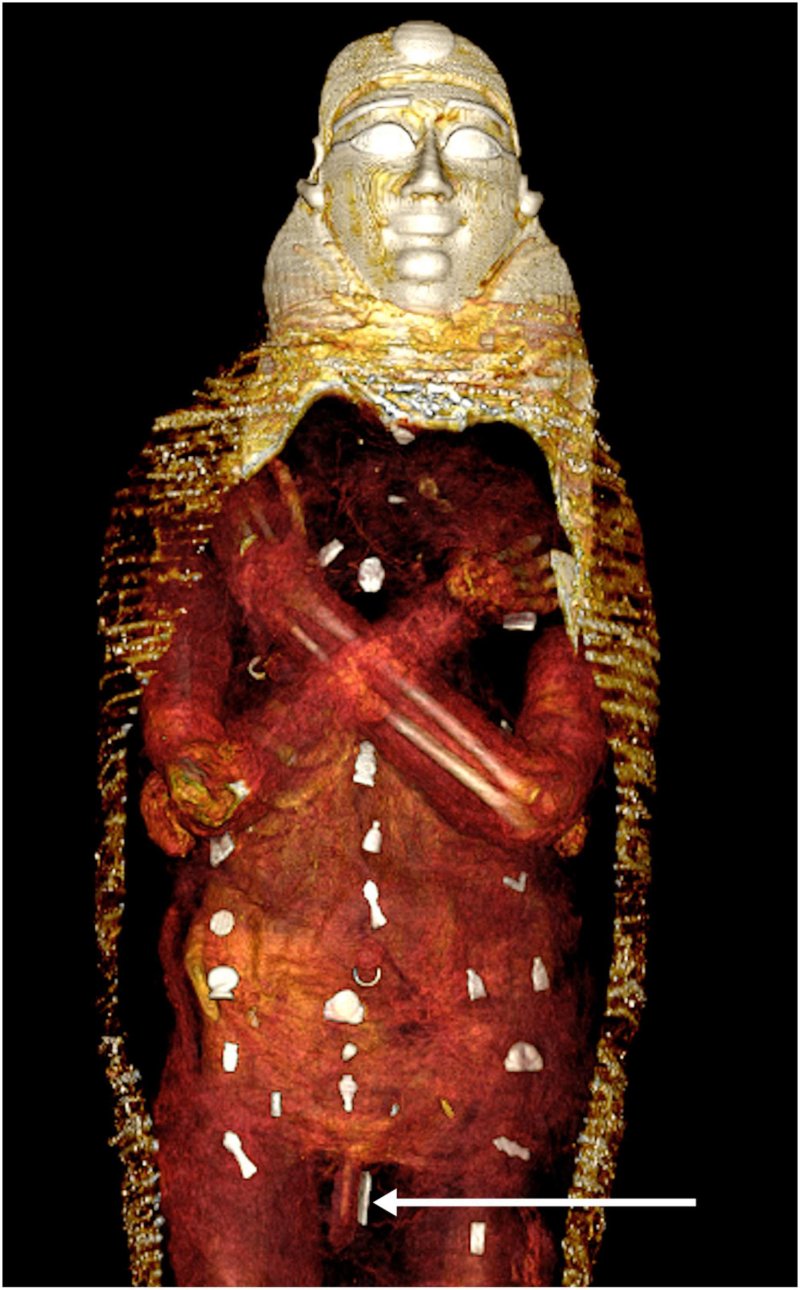 CT 촬영 결과, 연구팀은 관이 이중 구조로 되어있다는 사실을 밝혀냈다. 이중관 안쪽에는 128㎝ 신장의 미라가 금박을 입힌 가면을 착용한 채 누워 있었다. 연구팀에 따르면 미라의 생전 나이는 14세에서 15세 사이로 추정되며, 심장을 제외한 모든 장기가 제거된 상태였다.