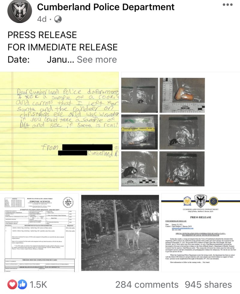 보도 자료는 "이달 초, 컴벌랜드의 어린 수사관은 산타클로스 및 그의 순록들의 DNA 증거를 찾기 위해 2022년 12월 25일 아침에 획득한 쿠키 일부와 당근 조각들에 대한 DNA 분석을 요청하는 편지를 제출했다"고 밝혔다.