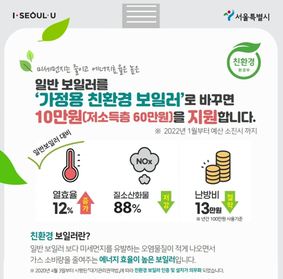 더구나 콘덴싱보일러는 미세먼지의 원인인 질소산화물과 온실가스인 이산화탄소 배출도 크게 줄일 수 있어 대기질 개선에도 도움이 된다. 이에 지난 2020년부터 사용이 의무화됐으며 지난 2018년부터 환경부와 지자체 주도로 보급을 확대하기 위한 지원사업(사진)을 진행 중이다. 이 제도를 활용하면 보일러 교체 시 10만원의 지원금을 받을 수 있다.