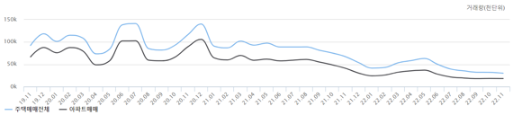 지속적으로 인구 이동이 감소하는 이유는 단기적으로 주택거래량 감소를 꼽는다. 현재 국내 기준금리는 2022년 1월 1.5% 대비, 2023년 현재 3.5%로 1년 새 2%p 급상승했다. 고금리 시대 진입에 따라 이동이 활발한 20대와 30대의 이동에 제동이 걸린 것으로 보인다. 부동산 가격이 하락 추이를 맞고 있음에도 고금리˙고물가 이중고에 목돈이 필요한 주택 거래는 계속해서 감소하고 있다.