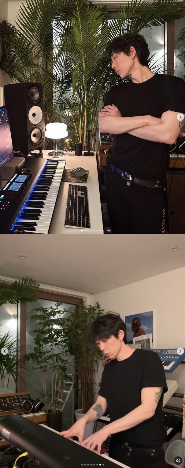 사진에서 코드쿤스트는 올 블랙 패션을 선보이며 시크한 분위기를 발산 중인 모습이다. 특히 그는 반팔 티셔츠에 드러난 근육질 팔을 공개해 모두의 이목을 집중시킨다. 또 그는 건반을 치는 모습으로도 뮤지션으로서의 면모도 뽐내 눈길을 끈다.