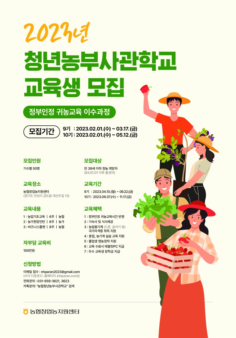 [세종=뉴시스] 박영주 기자 = 농협중앙회는 다음달 1일부터 2023년도 농협청년농부사관학교 제9기·10기 교육생을 모집한다고 31일 밝혔다.