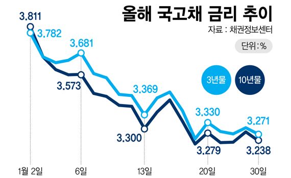 1일 금융투자업계에 따르면 최근 미국 연방공개시장위원회(FOMC) 경계감을 반영하며 국고채 3년물 금리는 연초 연 3.782%에서 1월 30일 기준 연 3.271%로 빠르게 내렸다. 한달만에 기준금리(연 3.5%)보다도 더 낮은 수준 아래로 떨어져 기준금리와 역전된 상황이다.