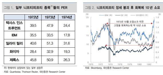 1일 대신증권에 따르면 지난 1970년대 초 스탠다드앤드푸어스(S&P)500 지수는 50개의 대형주인 니프티피프티(Nifty Fifty)가 장세를 주도했다. 이들 종목에는 제록스, IBM, 필립모리스, 코카콜라, 제너럴일렉트릭, 맥도날드, 월트디즈니 등이 있었다. 니프티피프티의 평균 주가수익비율(PER)은 1972년 41.9배에 달하는 등 과도한 고평가를 받았으나 1973년 제1차 오일쇼크를 기점으로 폭락했다. 높은 인플레이션과 고금리로 인한 증시 하방 압력은 장기간 이어졌고, IBM의 PER 또한 1972년 35.5배에서 1974년 17.8배로, 같은 기간 제록스도 45.8배에서 26.3배로 급락했다.