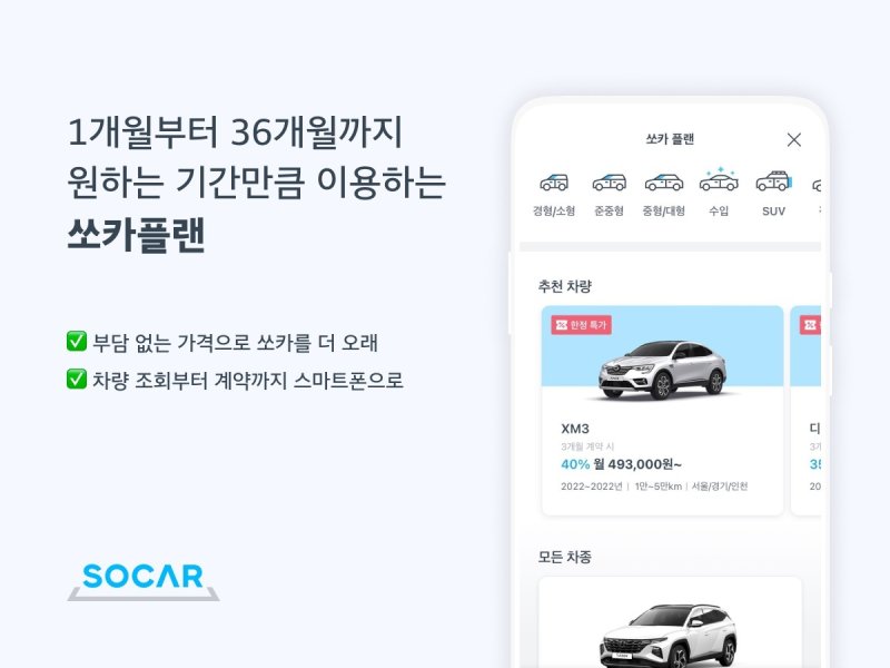 쏘카 플랜은 1개월 단위로 최대 36개월까지 이용 계획에 맞춰 대여 기간과 차종을 쏘카 앱으로 선택할 수 있는 서비스다.