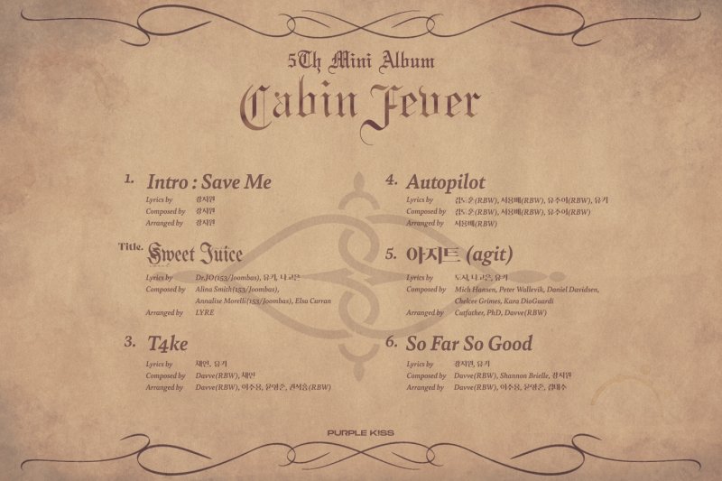 퍼플키스는 4일 공식 SNS에 다섯 번째 미니앨범 '캐빈 피버(Cabin Fever)'의 트랙리스트 이미지를 올렸다.