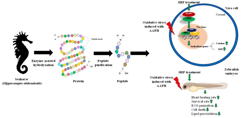 연구에 따르면 분자량 914Da(달톤·단백질 등 고분자물질의 질량 표시 단위)의 빅벨리해마에서 유래한 펩타이드가 원숭이 신장 세포 모델 실험에서 고농도에서도 독성이 없는 것으로 확인됐다. 또 산화가 유도된 제브라피쉬 모델에서 활성산소종, 세포사멸, 지질과산화 억제 효능이 있는 것으로 연구됐다.