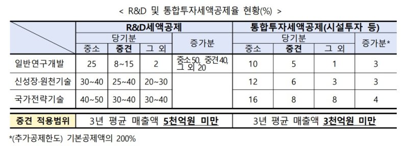 현행 세액공제 제도에 따르면 R&D 세액공제는 3년 평균 매출액 5000억원 미만, 시설투자 등 통합투자세액공제는 3년 평균 매출액 3000억원 미만 중견기업에 적용되고 있다.
