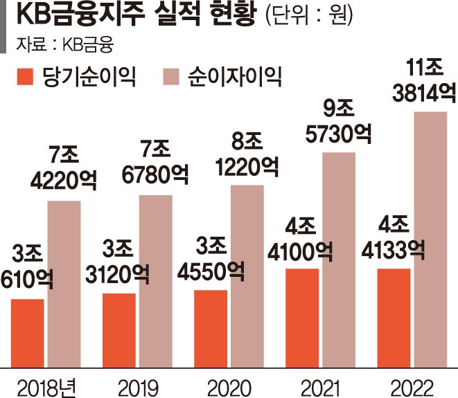 KB금융그룹 관계자는 "지난해 경제 및 금융시장의 불확실성이 지속된 어려운 영업환경 속에서 여신 성장 및 시장금리 상승에 따른 순이자마진 개선으로 이자이익이 큰 폭으로 증가했다"고 설명했다. 이어 "그동안의 그룹 핵심 사업부문에 대한 경쟁력 강화와 비은행 포트폴리오 다각화 노력의 결실로 그룹의 수수료 이익은 2년 연속 3조원 이상을 기록하며 과거 대비 이익 창출 체력이 높아졌다"고 덧붙였다.