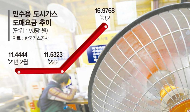 7일 한국가스공사에 따르면 이번 달 음식점업, 숙박업, 이·미용업 등 영업용으로 공급되는 민수용 도시가스 도매요금은 동절기 기준 메가줄(MJ)당 16.9768원이다. 이는 지난해 2월 11.5323원 대비 5.4445원(47%) 오른 수준이다.