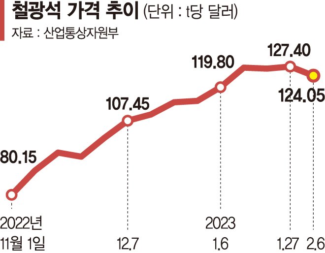 8일 산업통상자원부에 따르면 철광석 가격이 지난해 11월부터 상승세를 이어오고 있다. 중국산 철광석 수입가격은 지난해 11월 초 t당 80달러 초반 수준에서 머무르다가 지난 6일 기준 t당 124.05달러를 기록해 55.1% 증가했다. 전세계 원자재 수요 절반 이상을 차지하는 중국이 적극적인 경기부양책을 내놓자 철광석 가격도 동반 상승한 것이다.