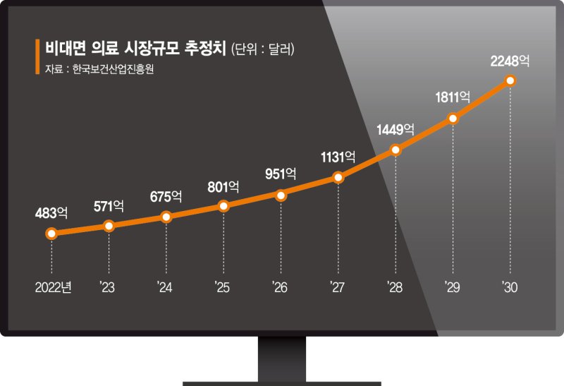 한편 한국보건산업진흥원이 지난달 18일 발표한 '키워드로 보는 2023년 국제의료 트렌드 분석 보고서'에 따르면 비대면 의료 시장이 코로나19 팬데믹의 여파로 2023년 571억달러(약 71조9745억원) 규모에서 2030년 2248억달러(약 283조3604억원) 규모까지 성장하며 연평균 성장률 18.8%를 기록할 것으로 내다봤다.
