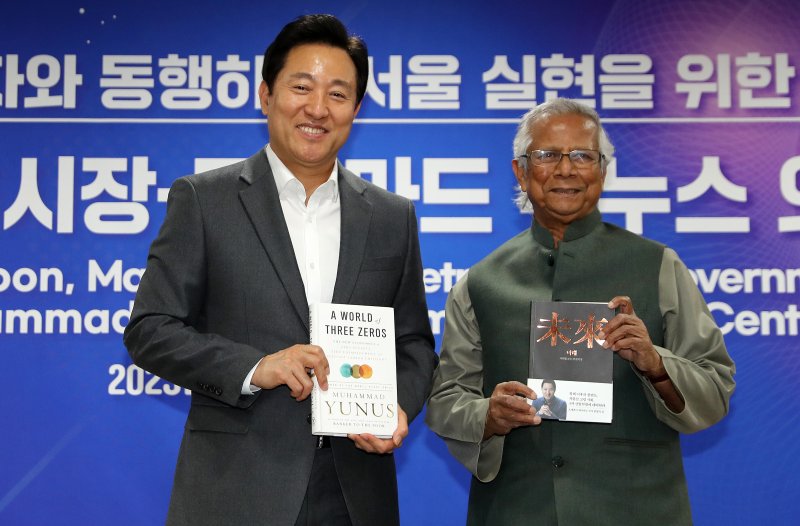 오 시장은 13일 오전 서울시청 8층 간담회장에서 빈곤 퇴치의 공로를 인정받아 2006년 노벨평화상을 수상한 유누스재단의 무하마드 유누스 의장과 '약자와의 동행'을 주제로 서울시 비전을 논의하는 대담을 진행했다.