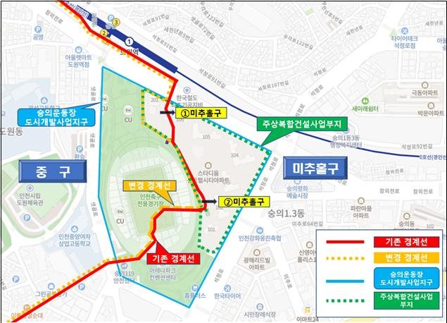 [서울=뉴시스] 오제일 기자 = 인천광역시 중구와 미추홀구로 행정구역이 나누어져 주민 불편이 발생했던 숭의운동장 주상복합아파트의 경계조정이 마무리됐다. 지난해 도입된 경계변경 조정제도를 통해 합의를 도출한 첫 사례다.