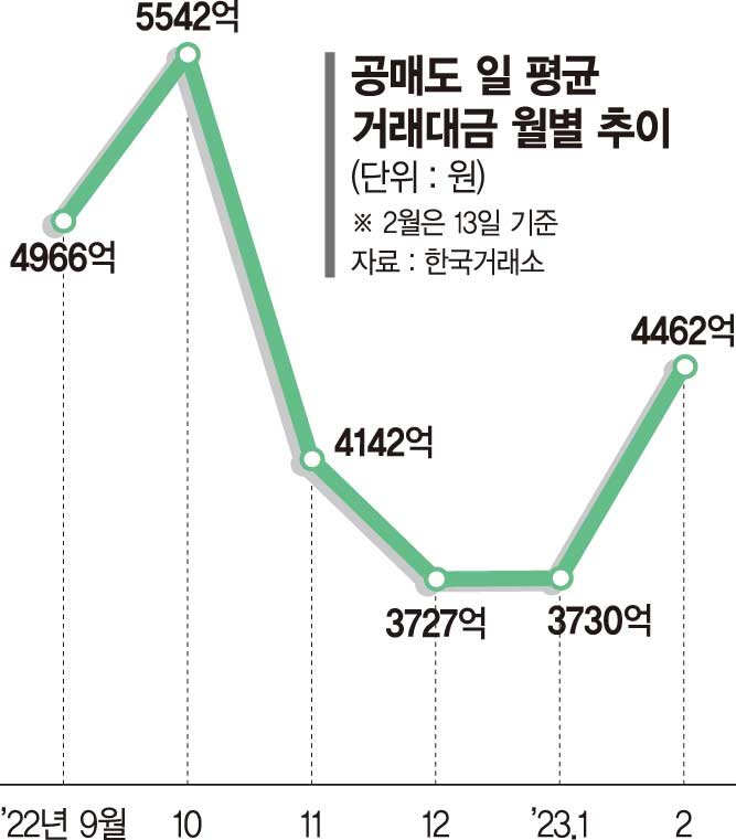 공매도 투자는 코스피지수가 급등한 지난 달부터 증가하기 시작했다. 하루 평균 공매도 거래대금은 지난해 10월(5542억원)을 고점으로 11월(4142억원), 12월(3727억원) 등 감소세를 보였지만 올해 1월에는 소폭 늘어났다. 이달에는 20% 가까이 증가하며 고개를 드는 모양새다.