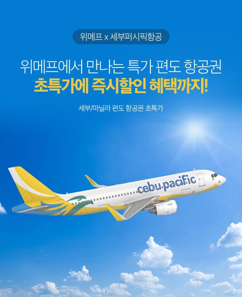 (서울=뉴스1) 한지명 기자 = 위메프의 종합 여행 플랫폼 W여행레저는 세부퍼시픽항공 세부·마닐라 노선 얼리버드 항공권을 특가 판매한다고 15일 밝혔다.