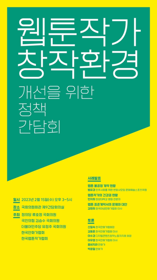 간담회에선 웹툰작가 불공정계약 유형 및 법적 근거에 대한 연구, 창작환경 개선 등이 다뤄진다.