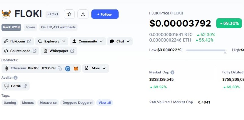 플로키는 16일 오전 10시 40분 현재(한국시간 기준) 글로벌 코인시황 중계사이트인 코인마켓 캡에서 24시간 전보다 69.30% 폭등한 0.00003892 달러를 기록하고 있다.