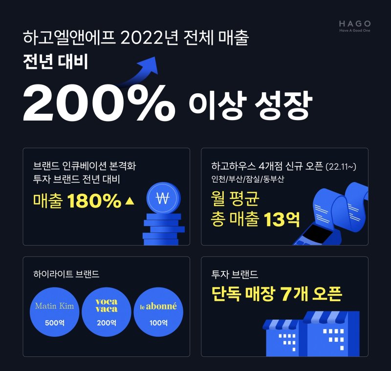 홍정우 하고엘앤에프 대표는 "지난 해 국내 최대 수준의 브랜드 투자 및 지원과 더불어 다각적인 오프라인 유통 전략 확대에 주력했고 이를 통해 브랜드 매출 상승과 함께 하고엘앤에프도 유의미한 성과를 거둘 수 있었다"며 "전도유망한 신진 브랜드들을 더욱 적극적으로 지원해 '기업 가치 1조원'을 목표로 성장세를 이어나갈 것"이라고 말했다.