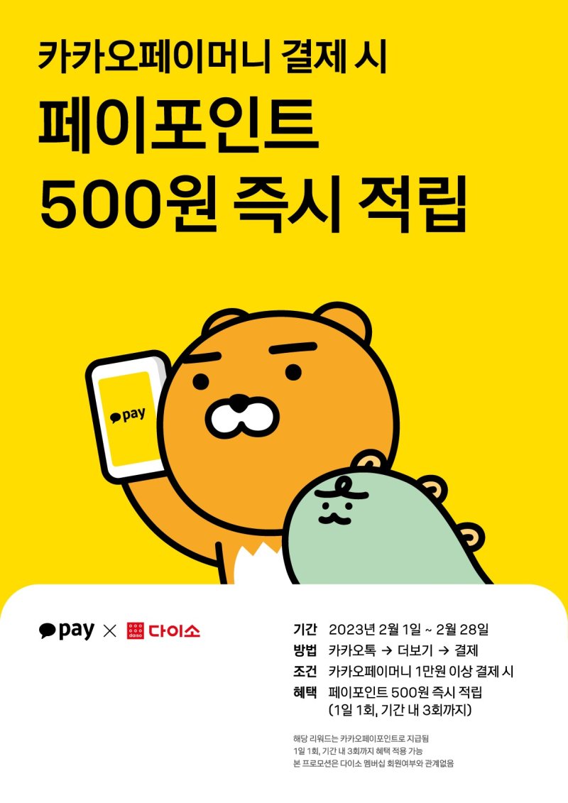 이번 이벤트는 28일까지 진행하고 다이소 매장에서 카카오페이머니 1만원 이상 결제 시 카카오페이 500포인트를 즉시 적립해준다.