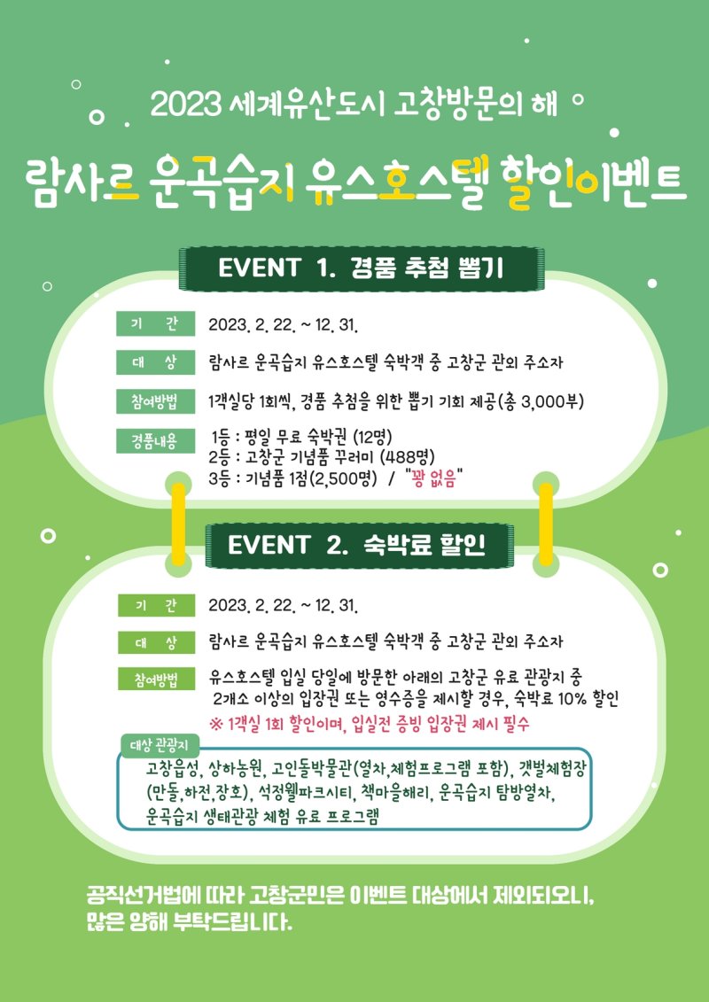 총 3000명 선착순으로 1등 12명 평일 무료숙박권, 2등 466명 고창군 기념품꾸러미, 3등 2500명 기념품 등 이벤트의 규모도 상당하다.