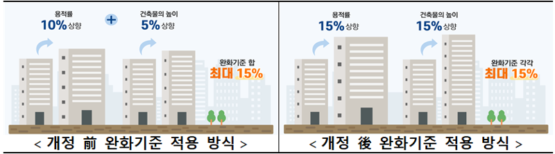 아울러 용적률, 높이에 대한 완화비율을 15% 범위에서 각각 적용한다. 완화기준 15%에 해당할 시 용적률 15% 및 건축물 높이 15% 상향이 각각 이뤄지는 것이다. 종전에는 획득한 완화비율을 용적률과 높이로 나누어 적용했다. 완화비율 10%라면 용적률 5%, 높이 5%로 상향하는 식이다. 혜택 중첩 적용과 함께 녹색건축물에 대한 인센티브를 늘려 조성이 활발해질 전망이다.