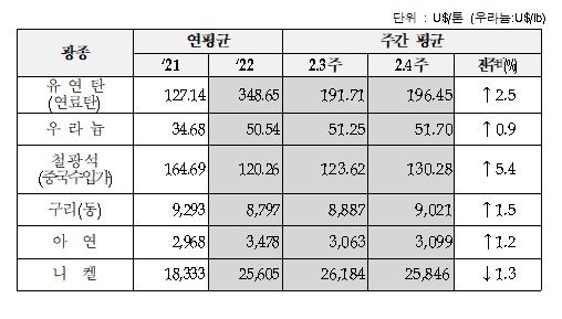 2월 4주차 주요 광물가격 동향 발표