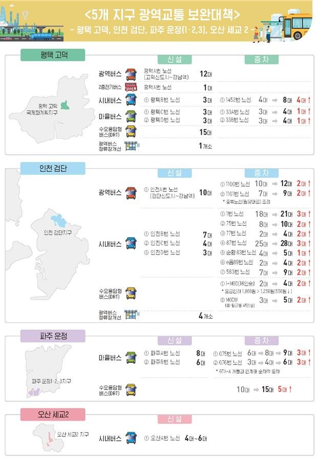 국토교통부 대도시권광역교통위원회는 평택 고덕, 인천 검단, 파주 운정1·2, 파주 운정3, 오산 세교2 지구 등 5개 지구의 광역교통 특별대책과 단기 보완대책을 마련했다고 1일 밝혔다.