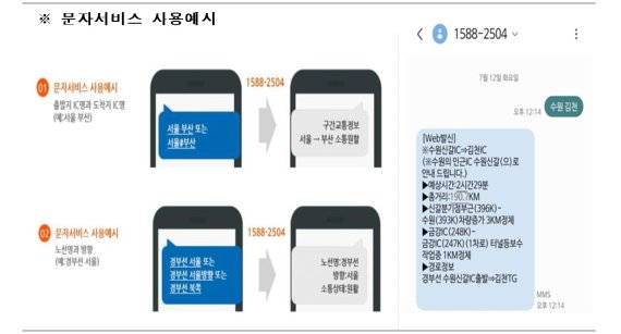 [파이낸셜뉴스] #. 한국도로공사 콜센터(1588-2504)에 출발지 IC명과 도착지 IC명을 문자로 전송하면 해당 구간의 도착 예상시간, 총거리, 정체 구간 등을 알려준다. '교통 정보 문자서비스'다. 인터넷 커뮤니티, SNS 등을 통해 '한국도로공사 콜센터 꿀팁'으로 불리며 이용자 수가 꾸준히 증가하고 있다. 하루 평균 문자서비스 이용건수도 2020년 377건에서 2021년 809건, 지난해 2428건으로 2년 만에 7배 수준으로 급증했다.