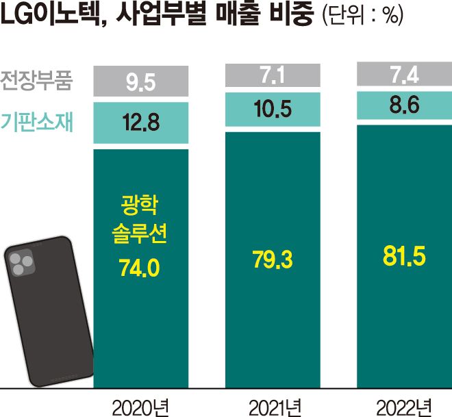 애플에 카메라모듈을 공급하는 LG이노텍 광학솔루션사업부 매출 비중이 처음으로 80%를 넘으며 역대 최고치를 기록했다. 아이폰 14 시리즈 판매 호조세에 힘입어 광학솔루션사업부 매출이 1년새 4조원 이상 증가한 영향이다. 다만 핵심 고객사인 애플 의존도가 과도하게 높아진 만큼 신사업 육성을 통한 사업 다각화가 시급한 과제로 떠올랐다.1일 관련 업계에 따르면 지난해 LG이노텍 광학솔루션사업부 매출은 15조9648억원을 기록했다. 전체 매출에서 차지하는 비중은 81.5%를 나타냈다. 광학솔루션사업부 매출 비중은 2020년 74.0%, 2021년 79.3%를 기록한 데 이어 사상 처음으로 80%를 돌파했다. 2021년 매출(11조 8457억원)보다 35% 가량 늘어났다.